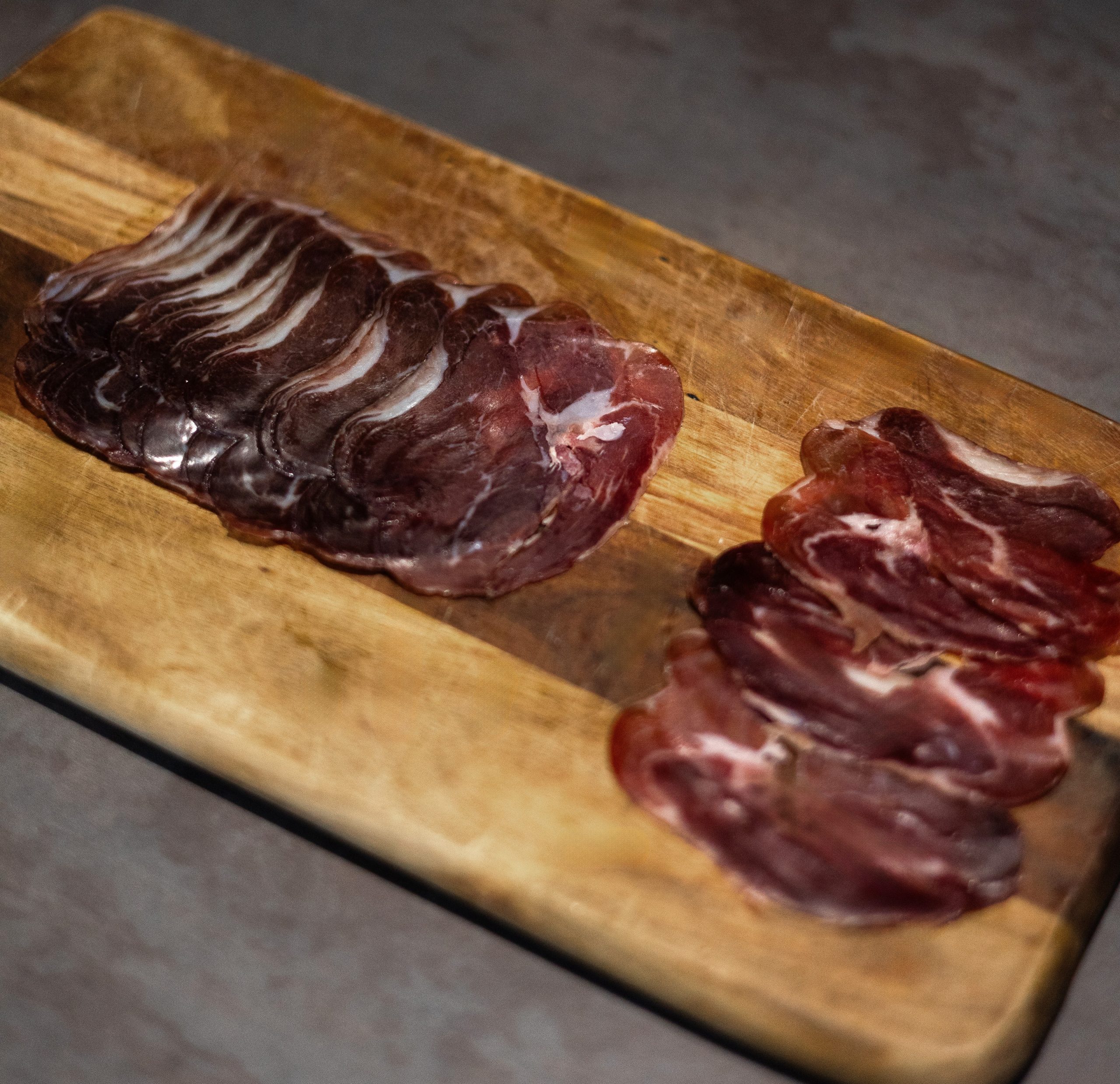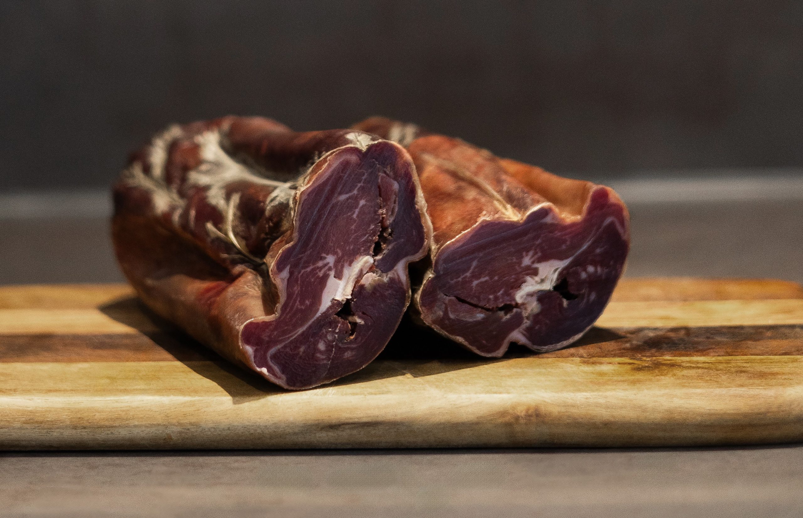 Viande séchée et affinée d’agneau, offrant une intensité de saveurs riche et délicatement fondante.